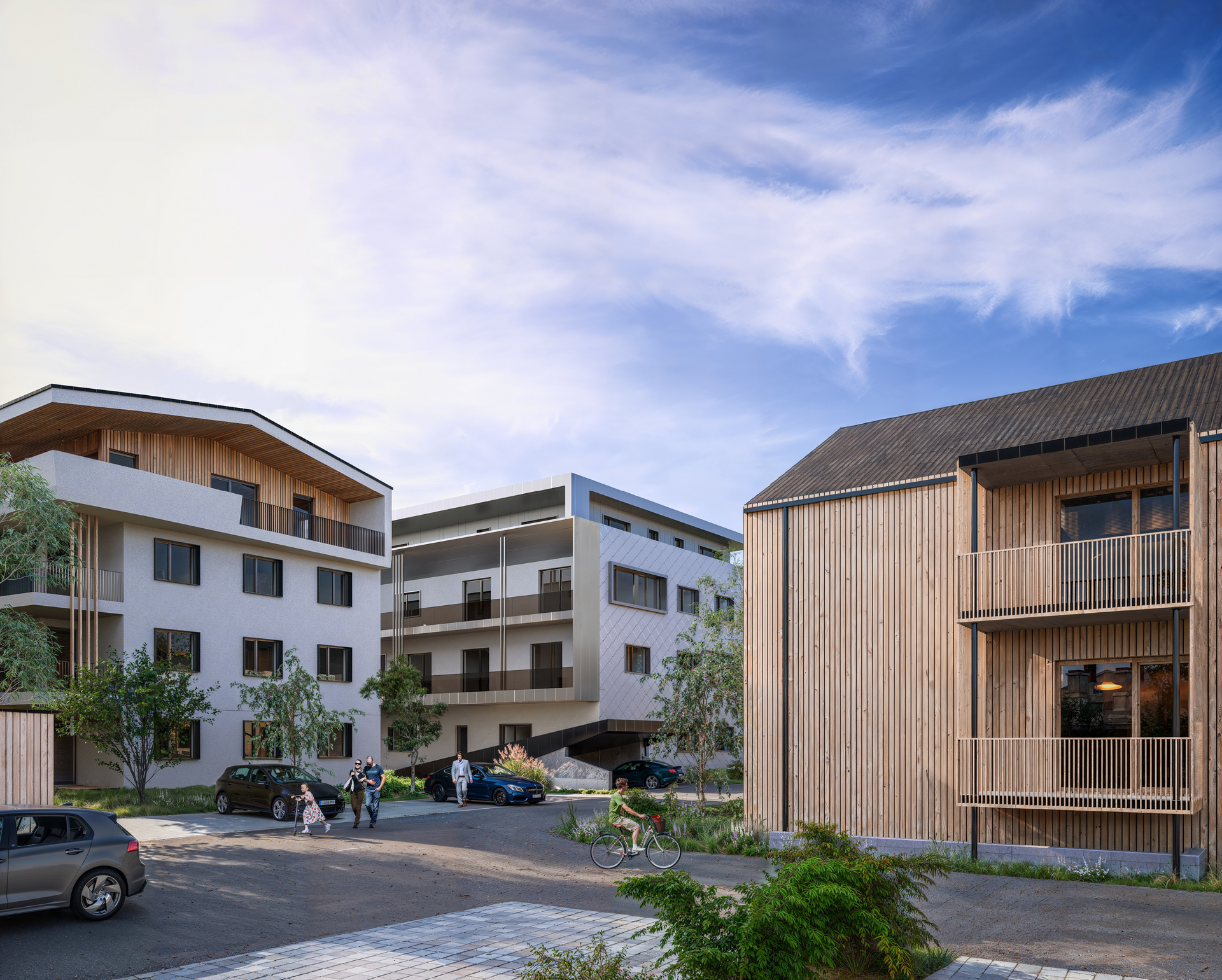 Im südlichen Teil des Grundstücks hinter dem Gesundheitszentrum werden 2 Wohnblöcke errichtet, die insgesamt 27 Wohneinheiten umfassen. Diese reichen von 2 bis 4 Zimmer Wohnungen inkl. zwei Penthouse-Geschossen mit großzügigen Dachterrassen.