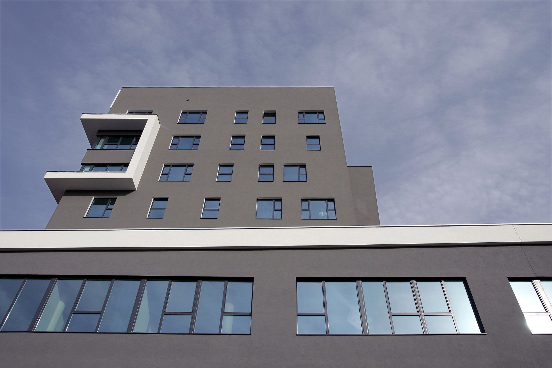 Das Gebäude ist ein wohl durchdachter Baukomplex aus zwei tragenden Elementen: dem Turm und dem Riegel. Diese zwei Elemente strukturieren das Gebäude und setzen auch farblich kontrastierende Akzente.